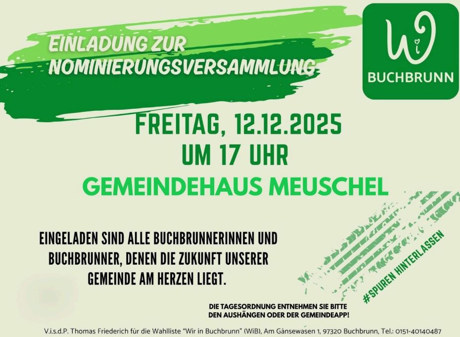 V.i.s.d.P. Thomas Friederich für die Wählerliste "Wir in Buchbrunn" (WiB), Am Gänsewasen 1, 97320 Buchbrunn, Tel 0151-40140487