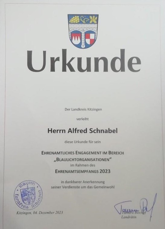 Er wurde vom Landkreis Kitzingen für sein ehrenamtliches Engagement in den Blaulichtorganisationen im Rahmen des Ehrenamtsempfangs mit einer Urkunde ausgezeichnet.